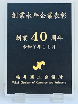 このたび当社は、福井商工会議所より「創業永年企業表彰(創業40周年)」を受賞いたしましたので、ご報告申し上げます。